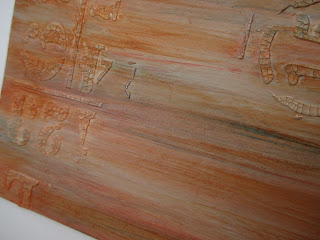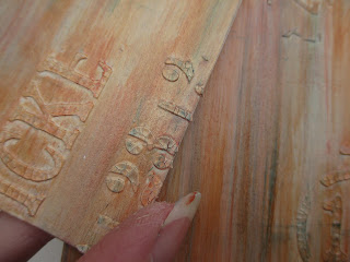 So some step x steps of the cover part ... I die cut the cover pieces from v thick card ( about 500gsm ). I then applied some DecoArt crackle paste through one of Andy Skinners new stencils -and left the crackle to do its magic! I then coated the pieces in titan buff paint (one of left painted )