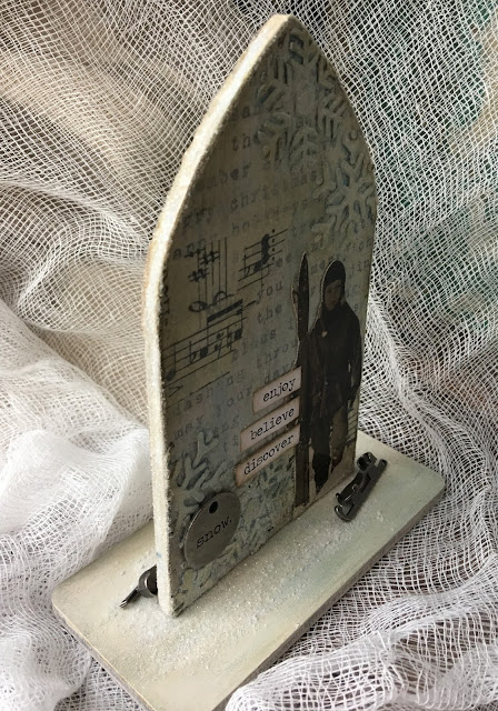 So the front of this mini free standing piece has lots of Tim Holtz goodness and lots of layers of distress crayons and collage medium..I know late to the party but I am loving the crayons!
