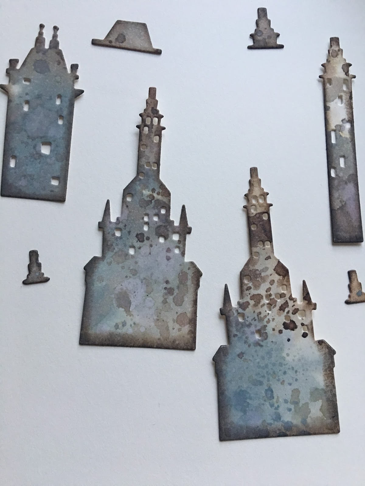 I due cut the houses using metropolis thinlits from Tim Holtz...using the pre-prepared piece of card and inked edges using ground espresso distress ink.
