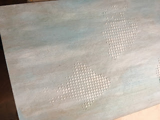 I started by giving the base a coat of distress paint in tumbled glass and smudged on some picket fence with my finger. I added some texture paste through dot fade stencil to add some texture, left to dry and coated with a layer of collage medium .