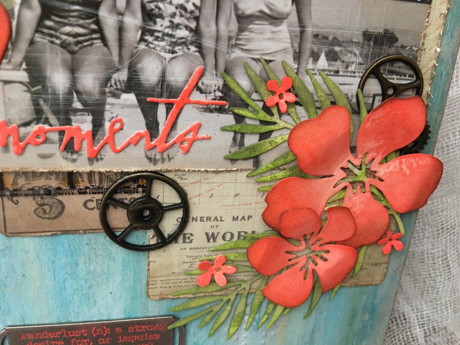 So now for the details...I wanted a splash of tropical colour and what better than shades of abandoned coral flowers and hand dyes seam binding...I used the Tim Holtz tropical dyes and distress spray stain to colour the foliage and flowers and then added walnut stain distress ink to highlight the edges.