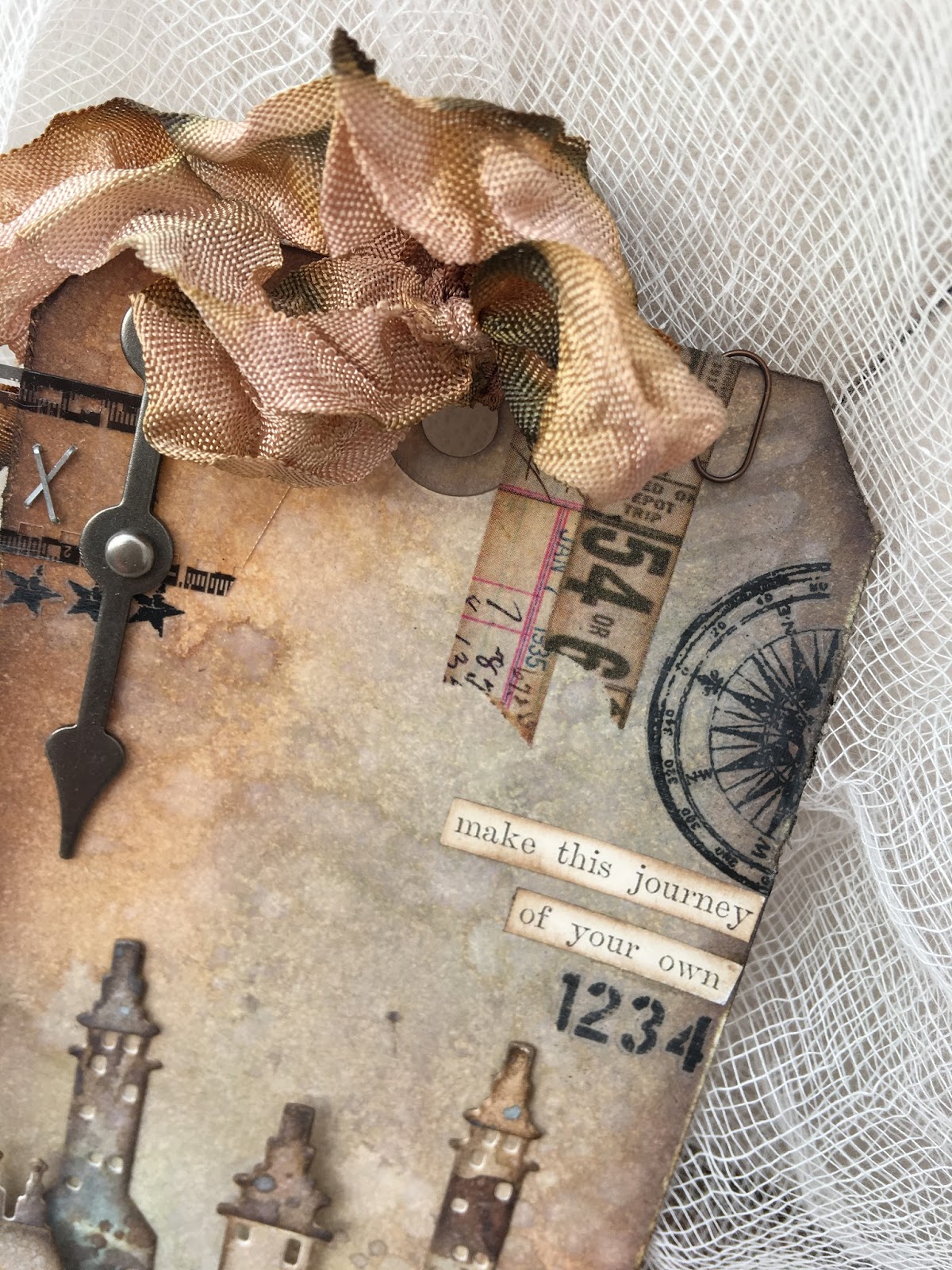 I placed them onto the tag to decide where to place them and added some collage medium and then some distress crayons..